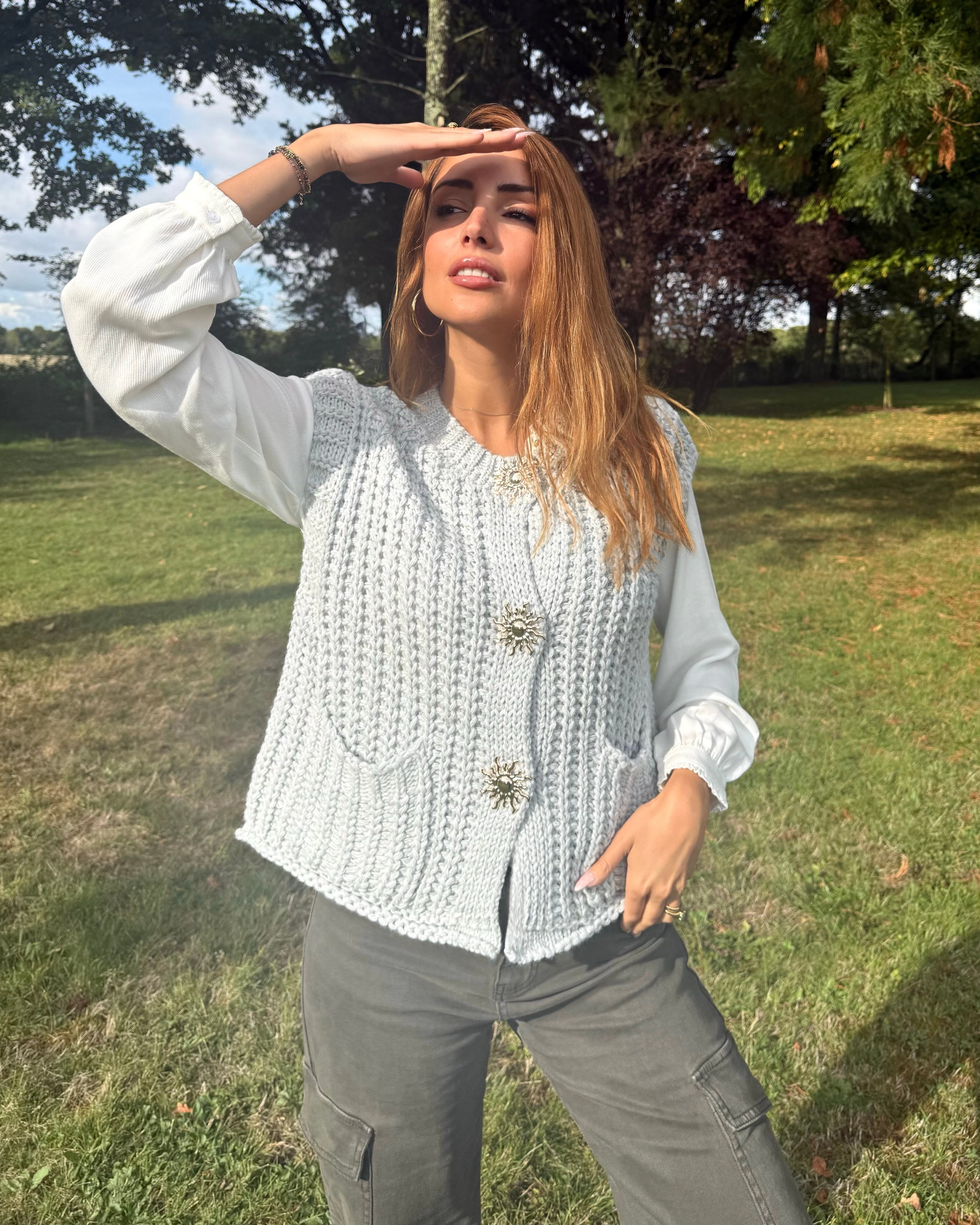Un gilet en maille bleu ciel super cosy 🤍 ! Ses boutons dorés soleil ☀️ et ses poches pratiques en font la pièce parfaite pour réchauffer une chemise ou un top.