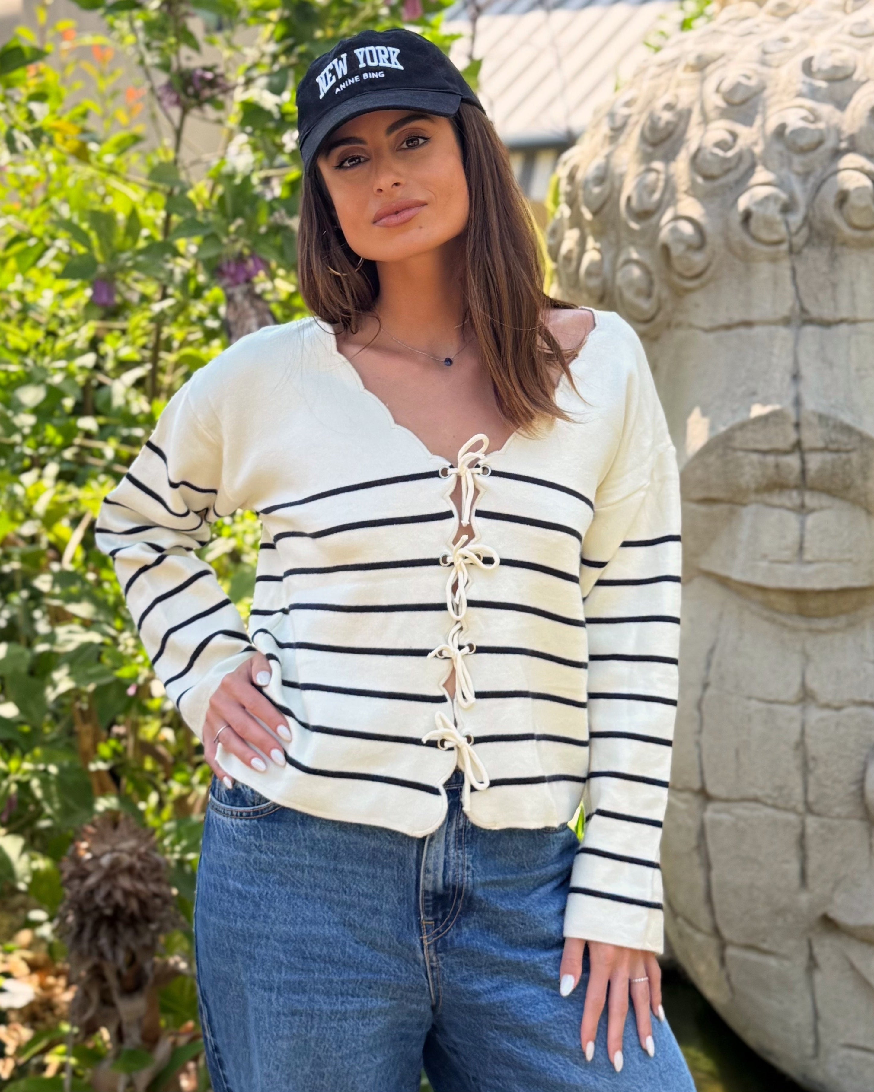 Un vent de fraîcheur souffle sur la marinière 🌊. Ce gilet à rayures fines se distingue par son joli laçage sur le devant et son col festonné ultra-féminin. Léger, doux et plein de charme, il twiste un look classique avec une touche originale et un brin sexy 💫.