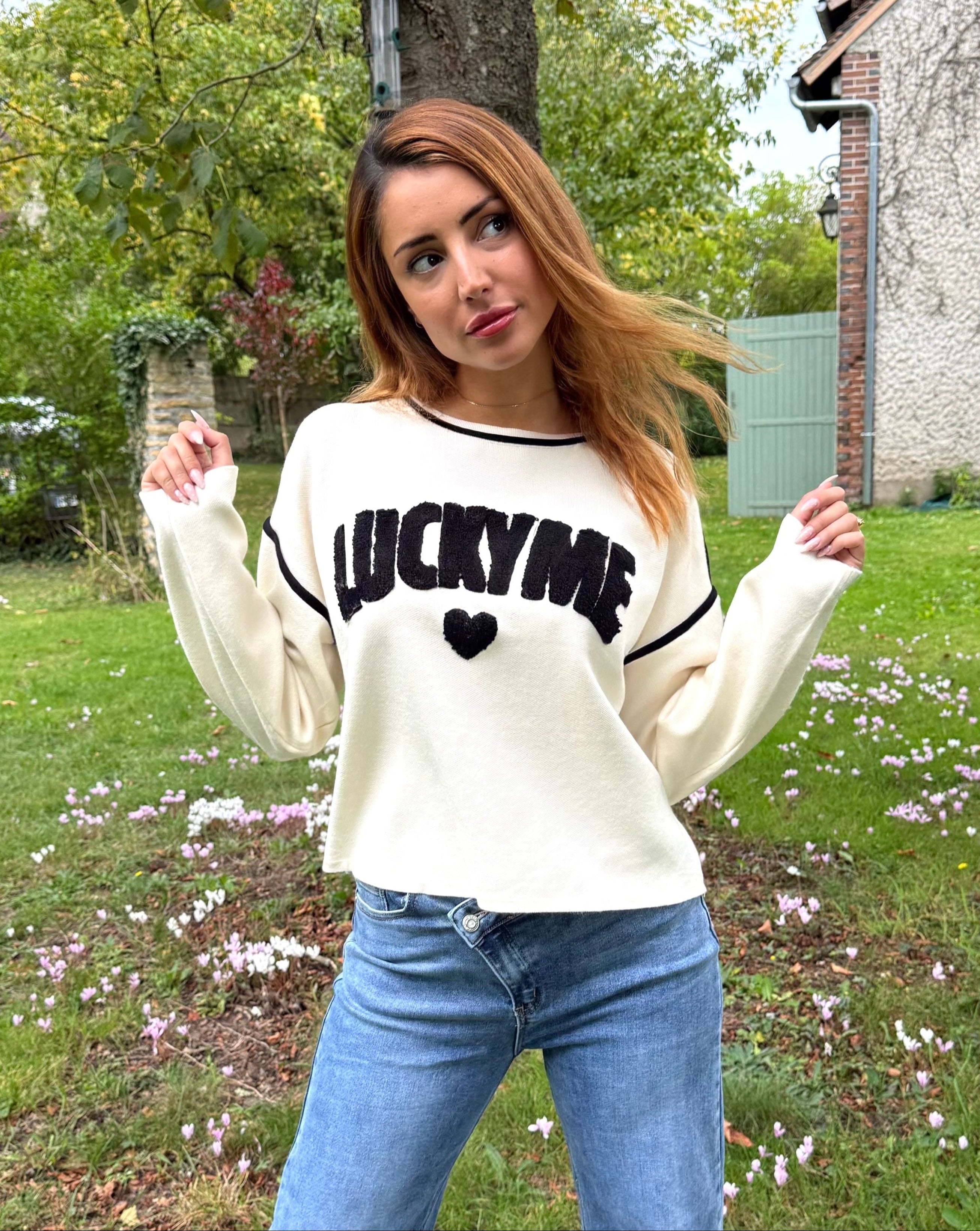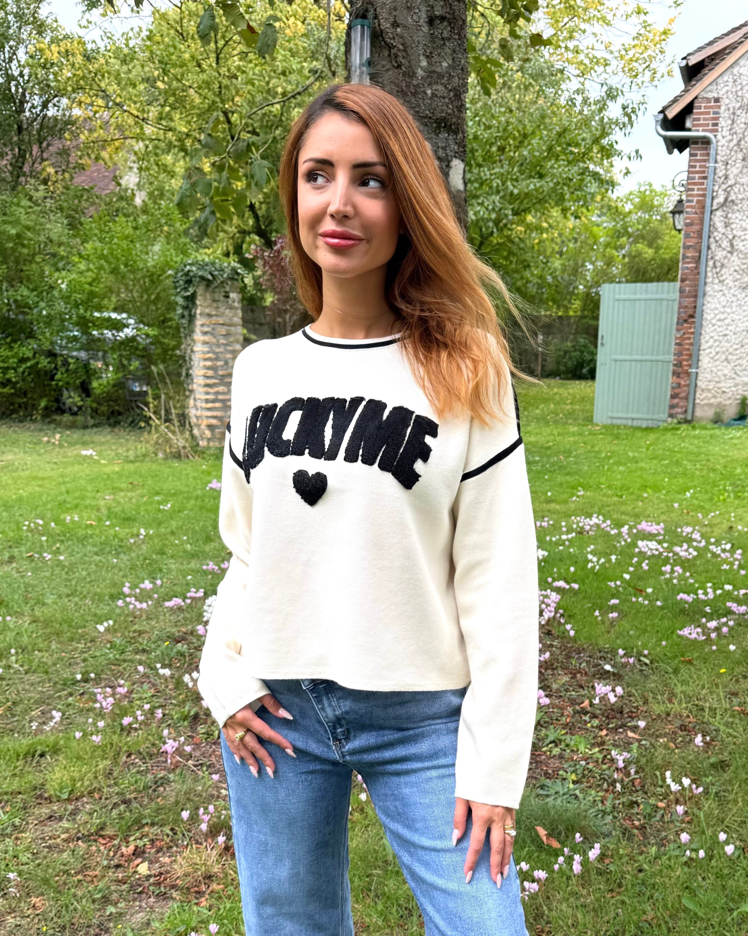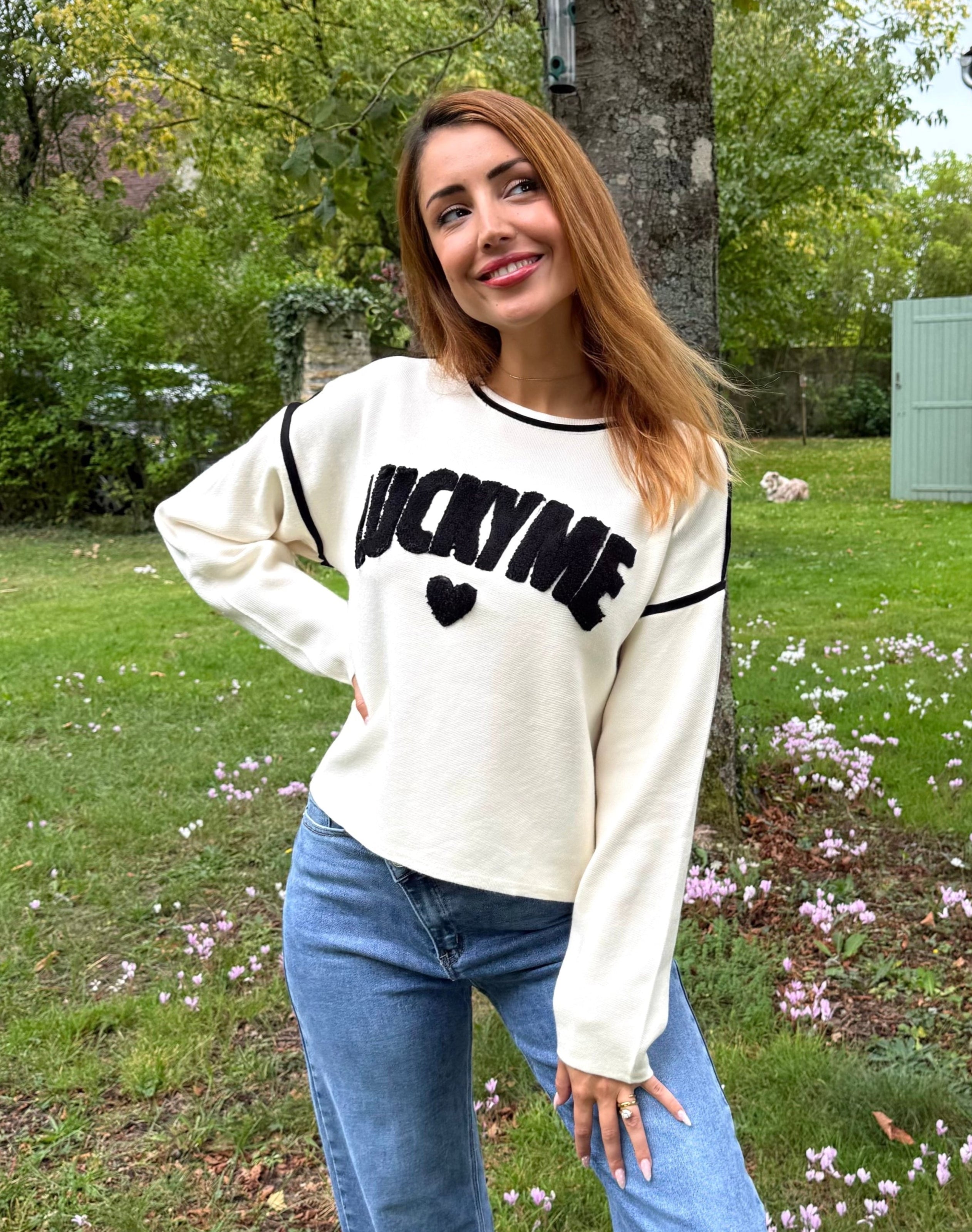 Le pull good vibes ✨ Confortable, ce pull écru à manches longues est accompagné de son message LUCKY ME en relief noir, avec un petit cœur pour un look à la fois casual et stylé comme on aime. Facile à associer avec un jean ou une jupe pour un style cool et féminin.