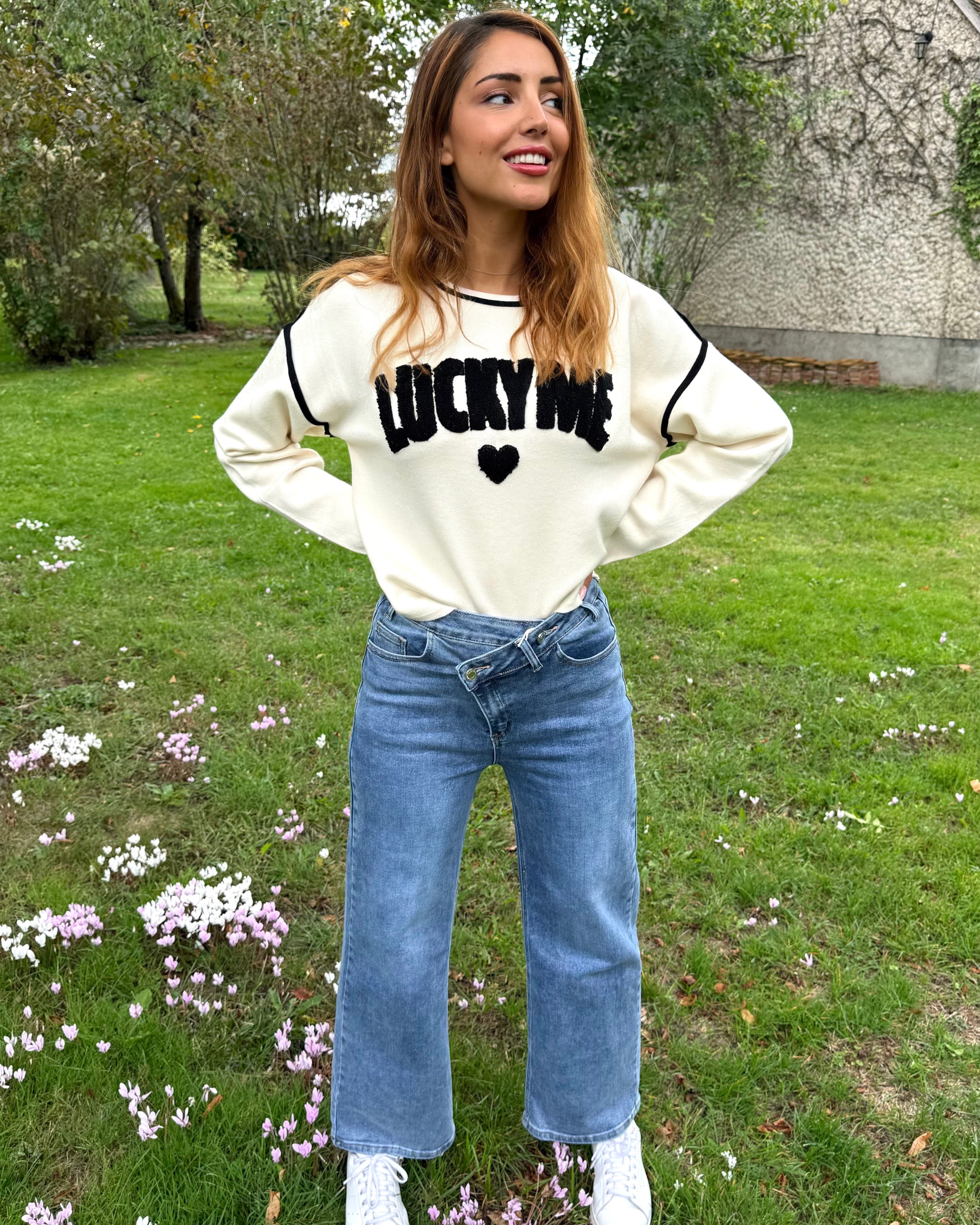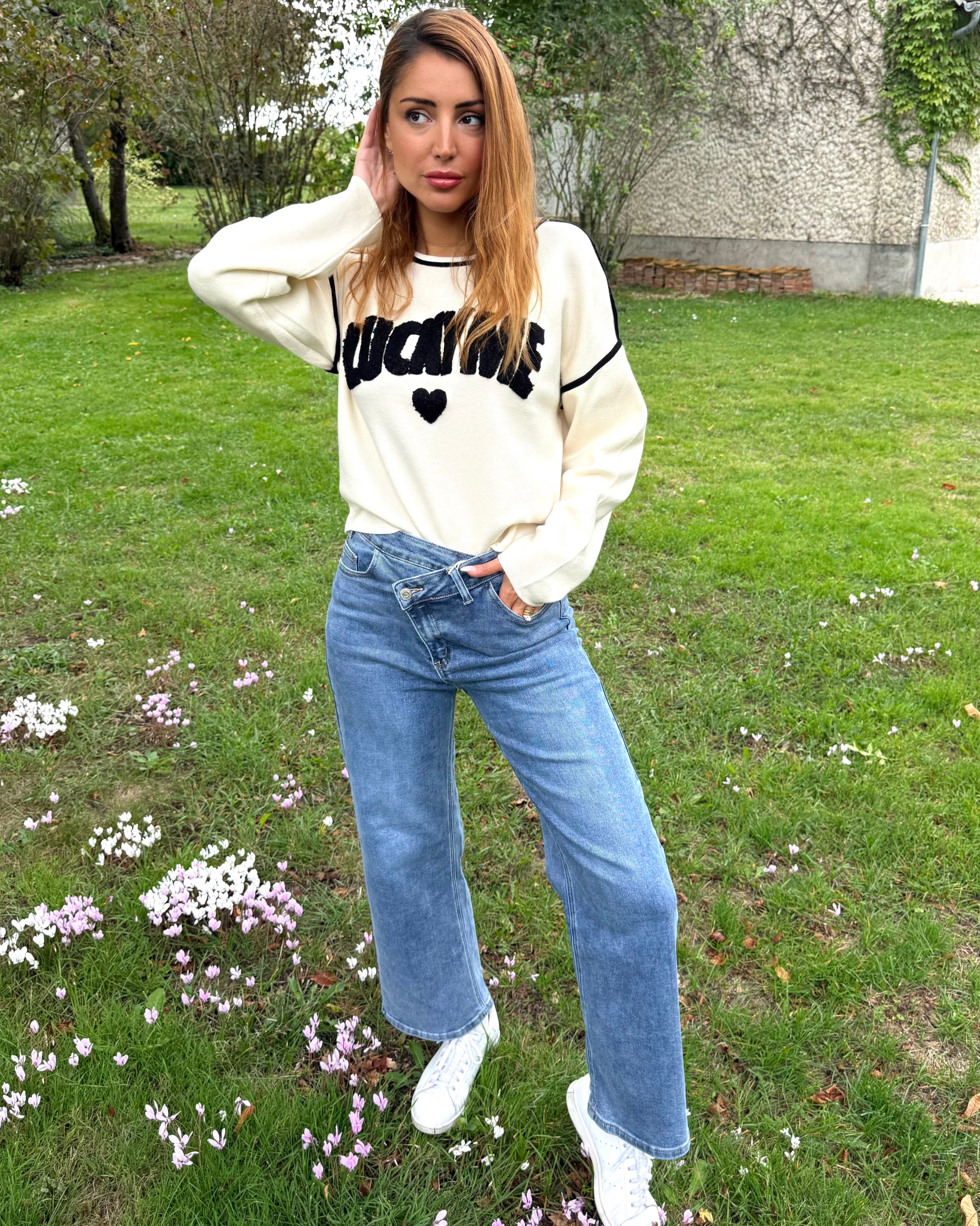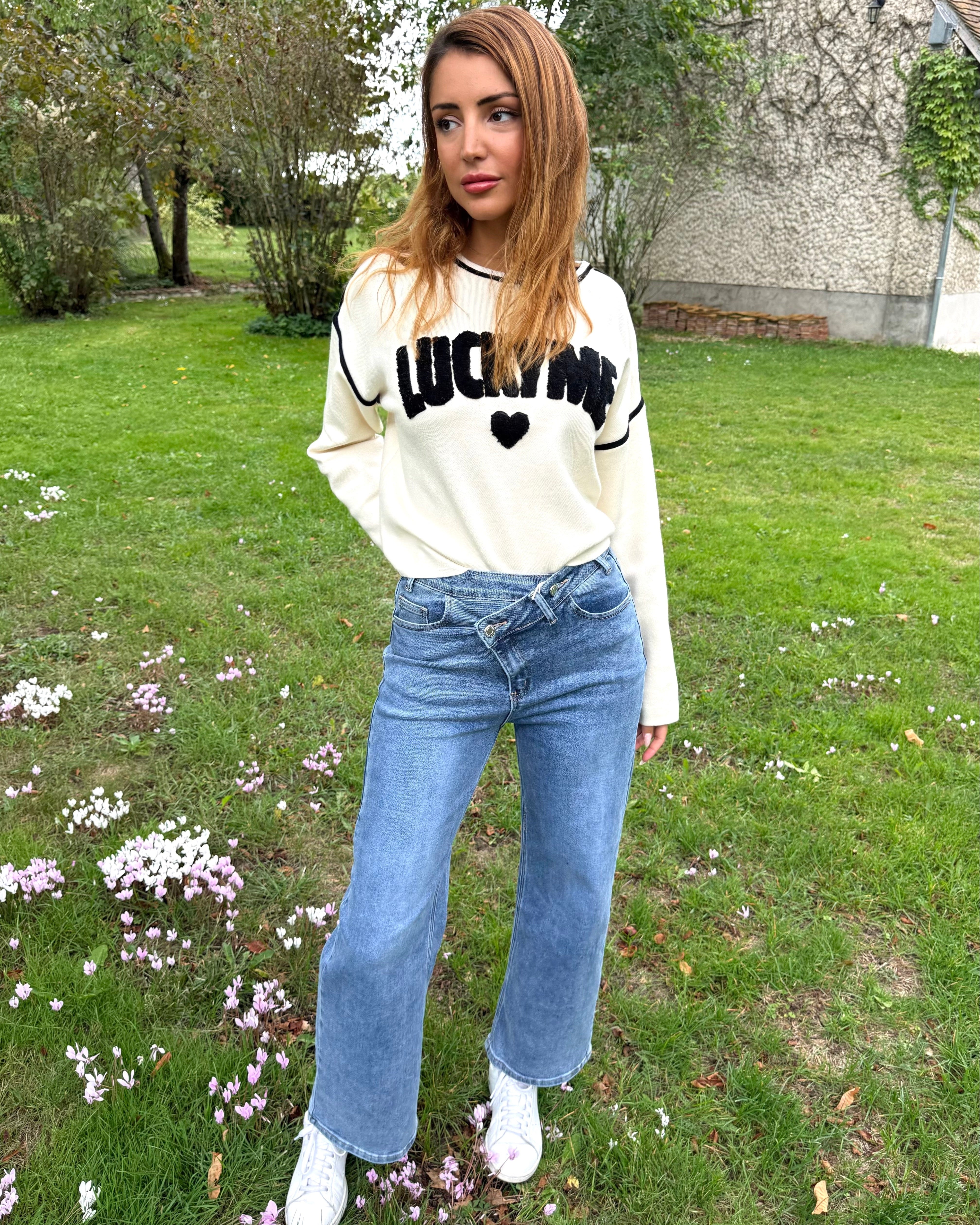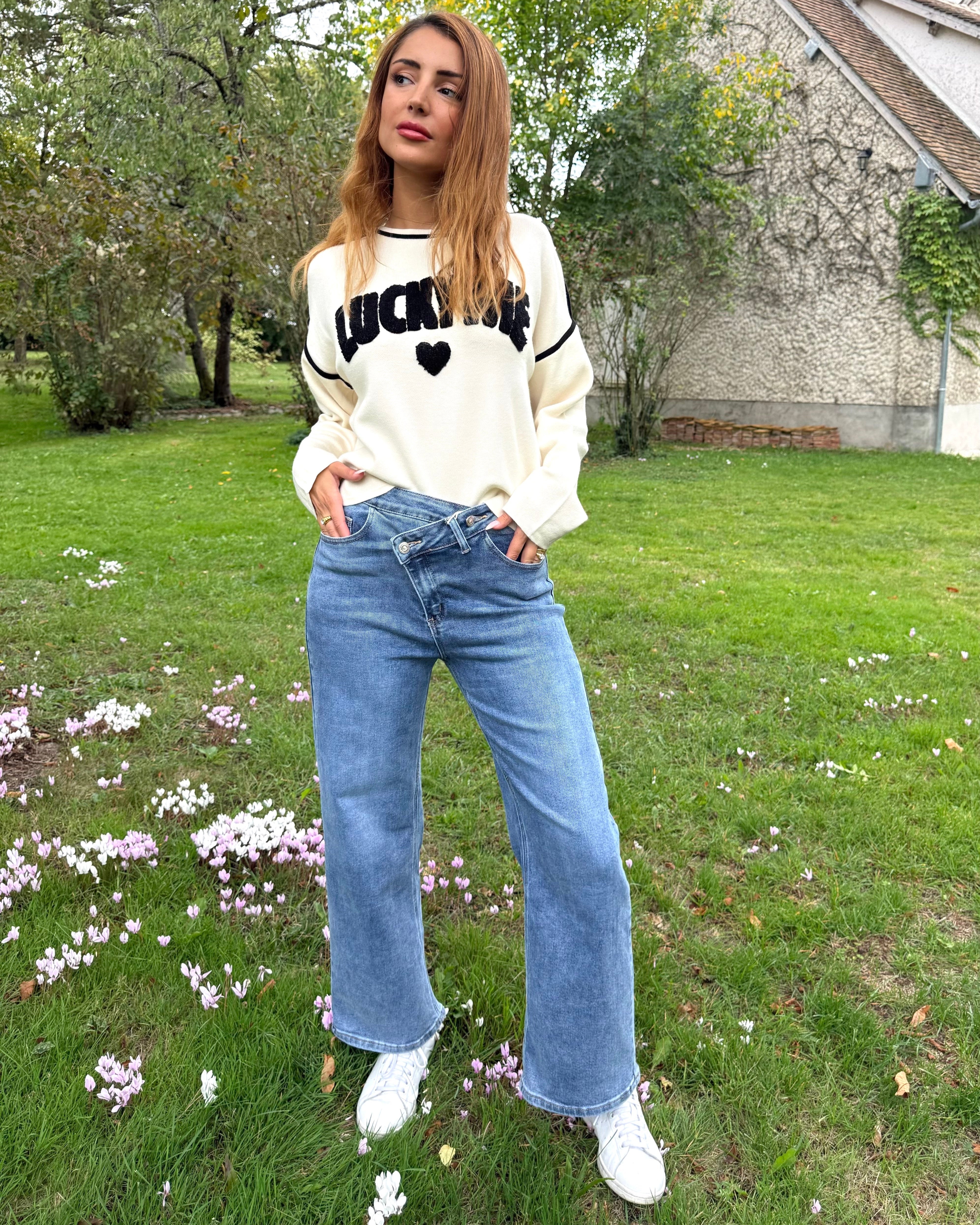 Light blue high-waisted jeans with a crossover belt detail. Comfortable, stylish, and easy to wear every day.